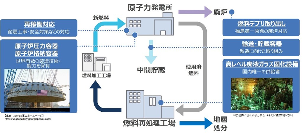 近年は、小型モジュール炉の技術開発や次世代炉への取り組みの一環として、ASME Div.5認証を取得いたしました。また、福島第一原発の廃炉、燃料デブリの取り出し、使用済み核燃料の輸送・保管、放射性廃棄物のガラス固化技術開発など、原子力産業のバックエンドビジネスにも積極的に取り組んでおります。